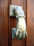 doble finalidad: Llamar golpeando sobre un grueso clavo y servir de tirador para conducir la puerta en su apertura y cierre.